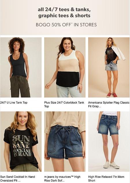 Get it now! Shop in-store and get all 24/7 tees & tanks, graphic tees, & shorts at buy one, get one 50% off.